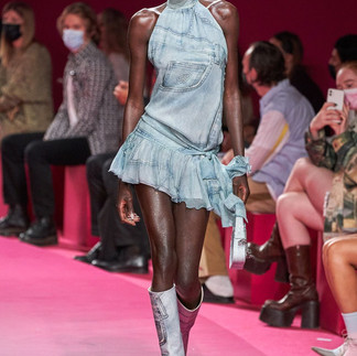 The glittered bodies,neon tones, denim on denim, floral prints, butterfly motifs and overall Y2K aesthetic, the collection brings a sort of nostalgic feel once again. In an interview with Vogue, Nicola Brognano, creative director for Blumarine says, “I’m inspired by social media, by the girls dressing for real life on instagram and TikTok”. Moreover, I believe that Brognano is suggesting that in today’s craze for everything nostalgia, thus the resurgence of the Y2K aesthetic, it’s safe to say that Blumarine is not looking for source material. Rather, Brognano is looking at Gen-Z and what is being posted on social media platforms like Instagram and TikTok which in the present day is filled with early 2000s-esque looks. Which trends are trending right now and how can Brognano implement it into his collection? And to answer that question Brognano has done an amazing job at doing so for the past three collections he has presented since being named creative director of the brand.